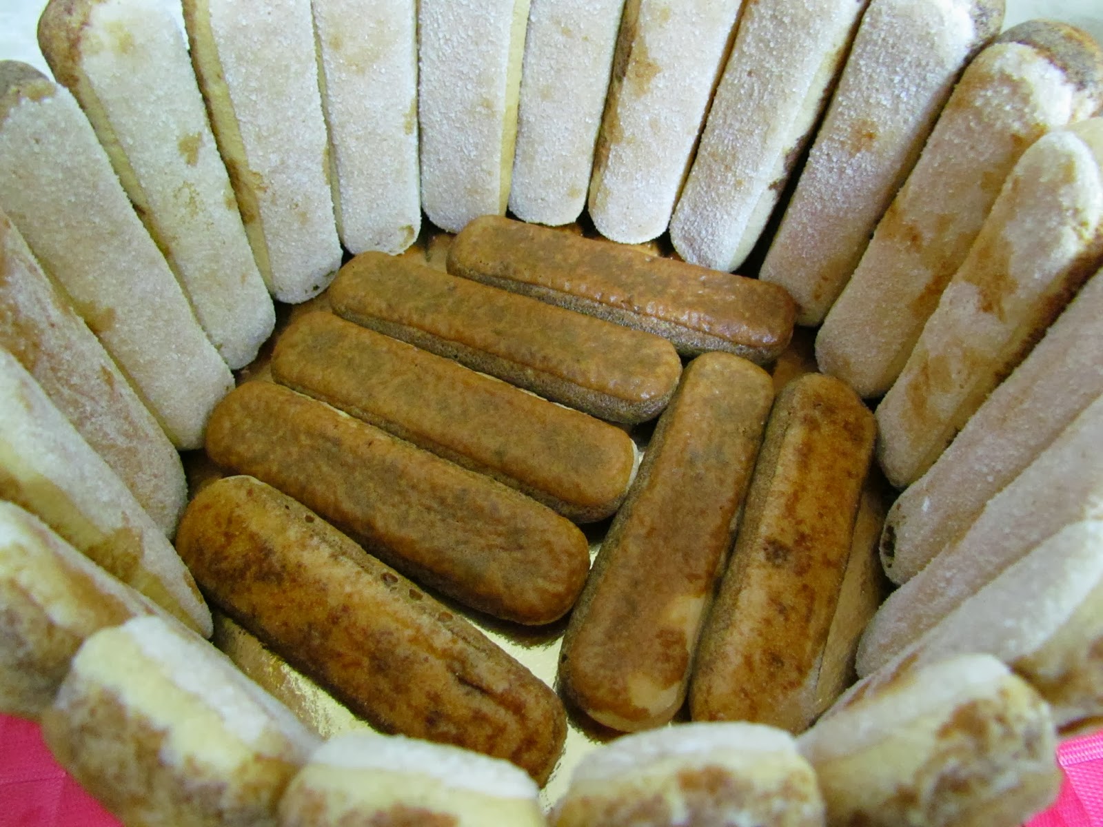 הבישקוטים צמוד. מסביב לתבנית הרטבתי רק צד אחד של הבישקוטים בקפה כי רציתי שהם